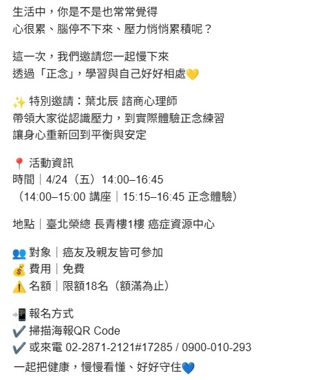 活動訊息 🌿【正念減壓・觀心靜】免費活動邀請🌿 ![]() ![]()